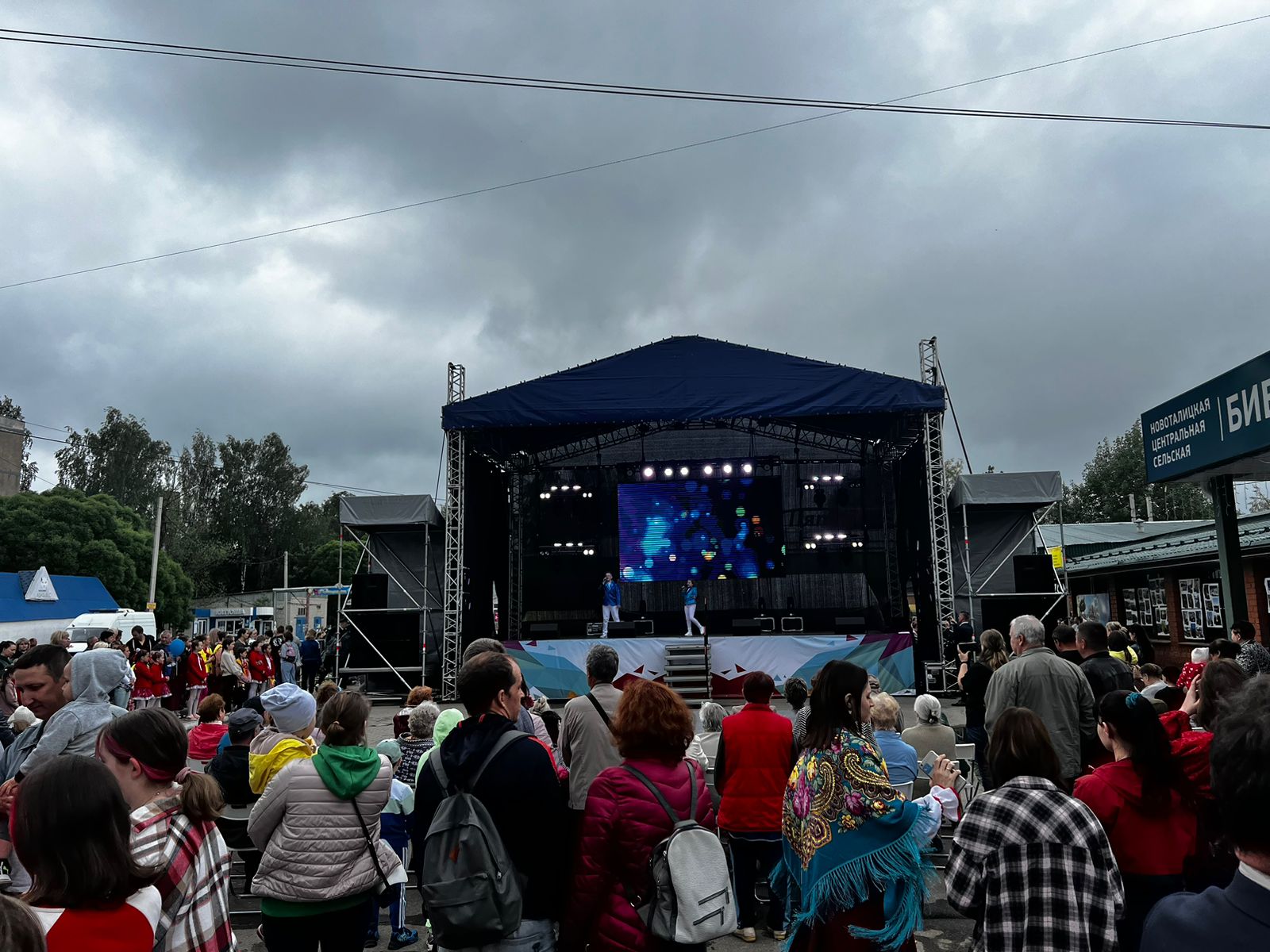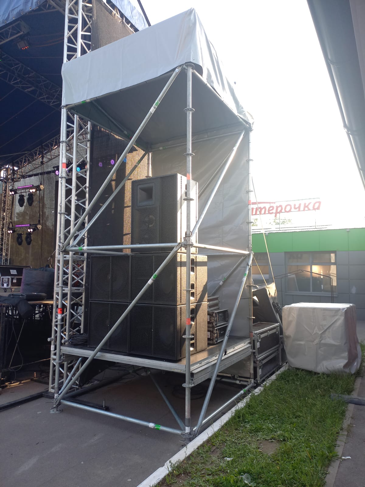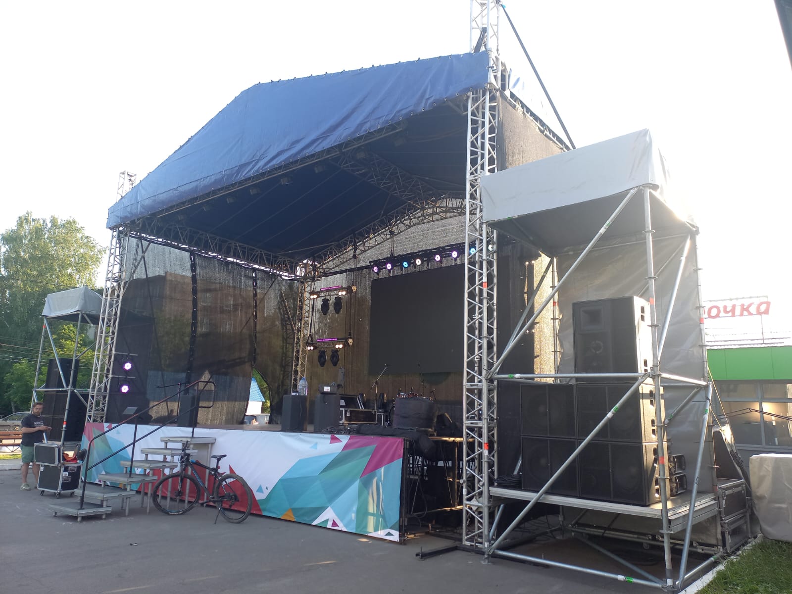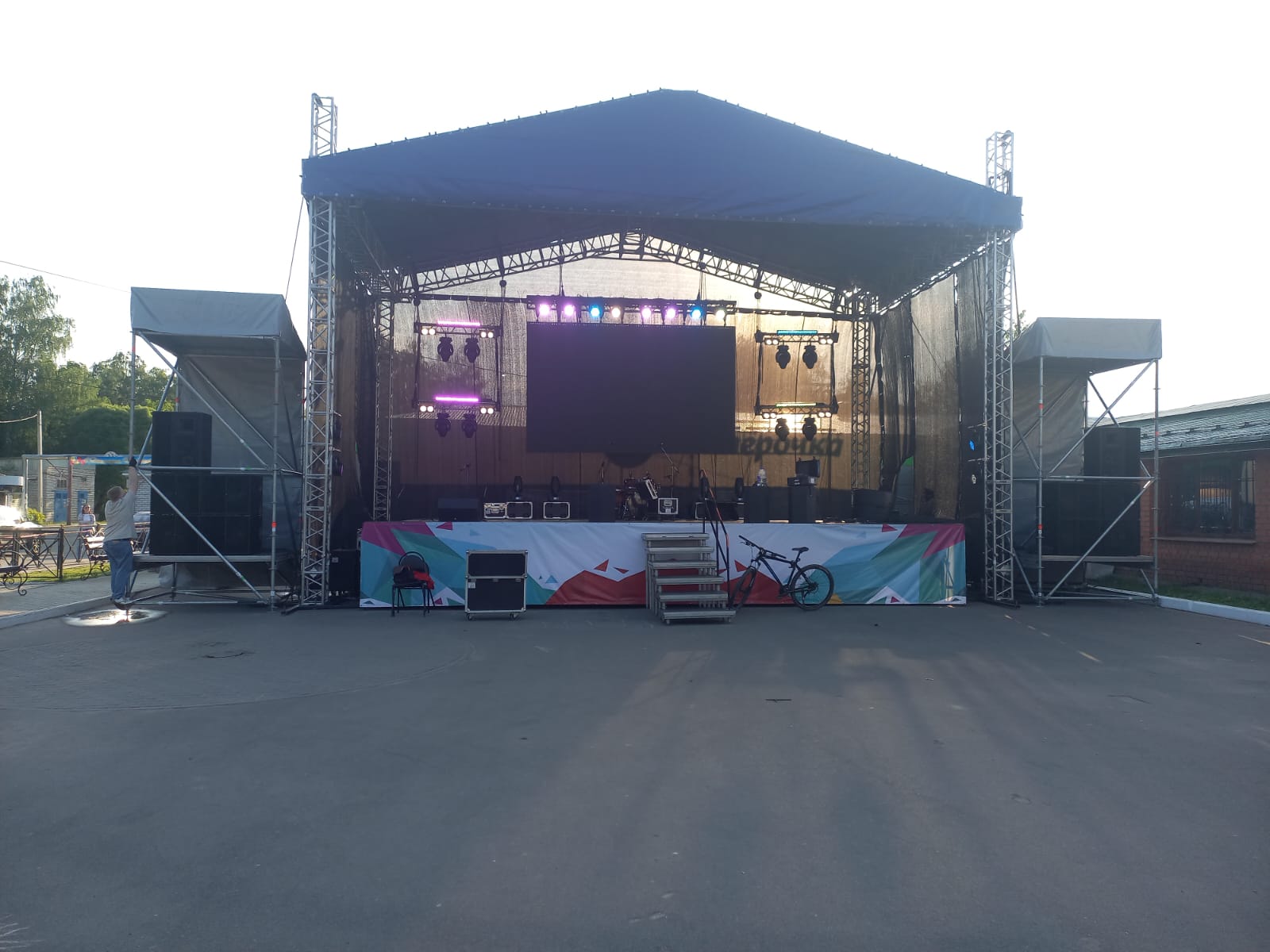 Оборудование: сцена 9,6*7,2 м. + порталы под звук, LED-экран 3*4м, звуковой комплект VHD 10KWt, свет